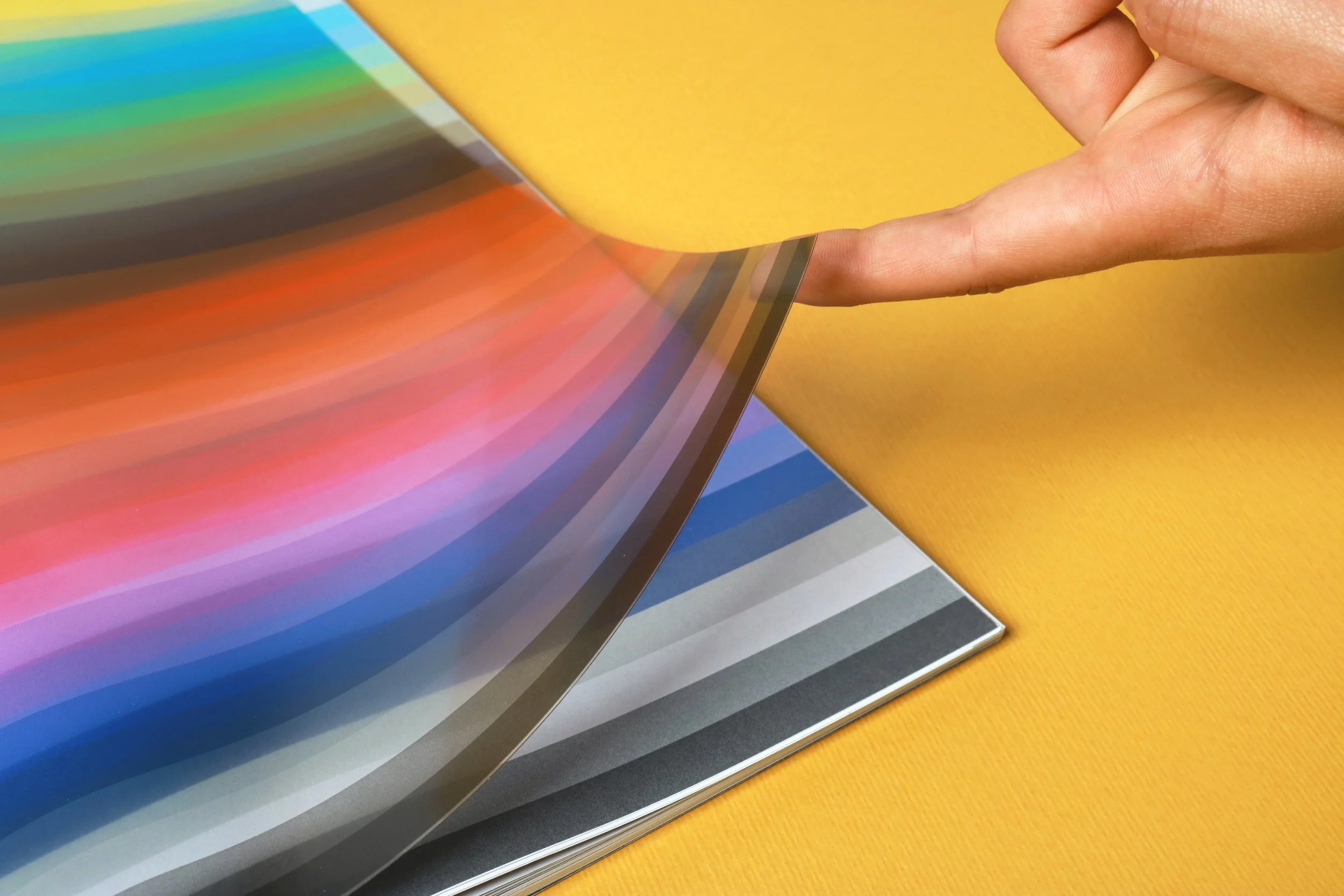 Since the book is full of color, I left the cover white. To give a glimpse of the whimsical content, I cut off about an inch of the cover to expose the bottom page which contained a layering of 30 colors for the 30 creatives, with a relief effect of matte and translucent paper.