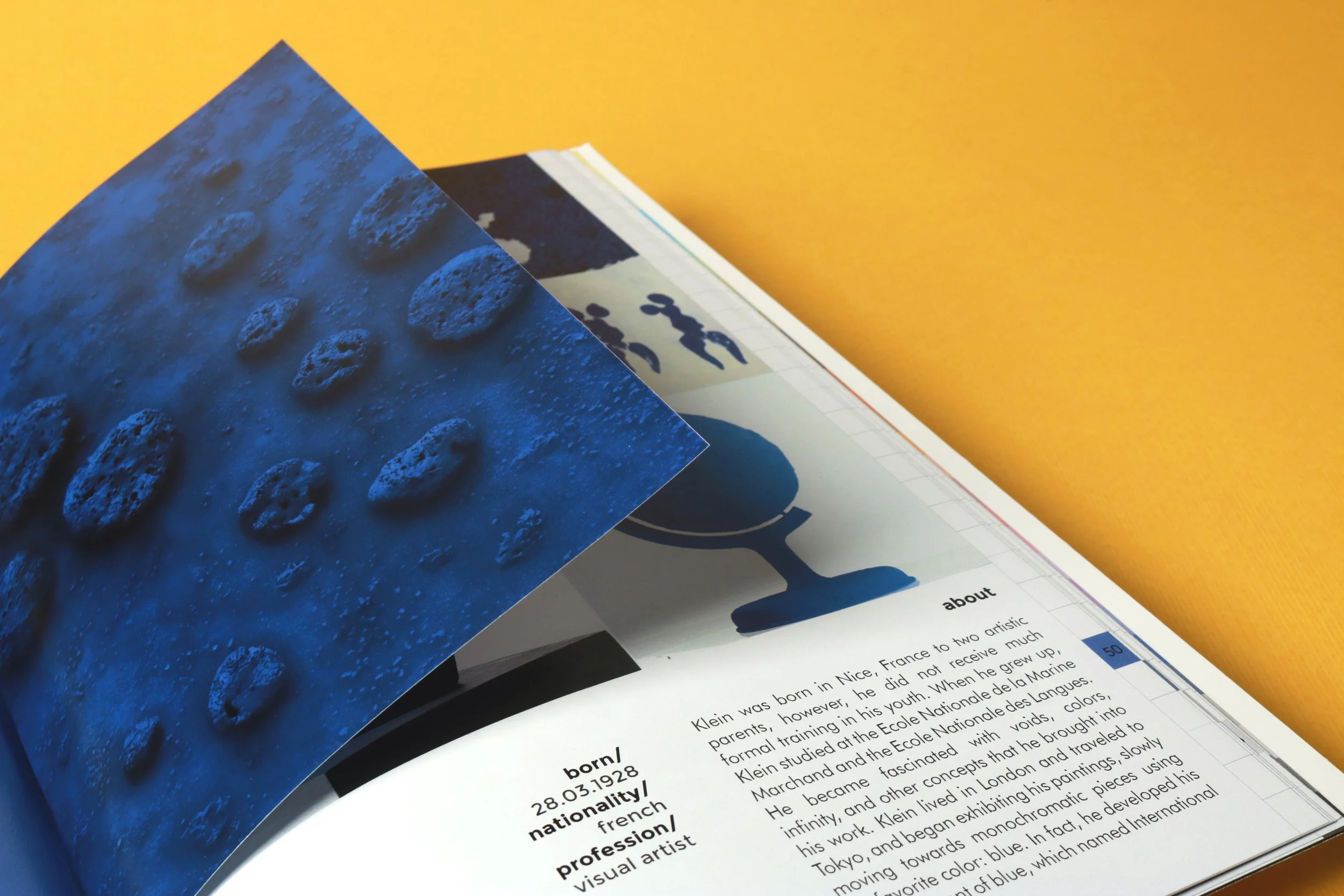 Central to my design process was ensuring that each person’s work is the center of attention, almost like curating a museum in book format. This vision informed every design decision. Each creative was assigned a color (the most dominant color in their work using the eyedropper tool) and was used to color code the page numbers (e.g. Yves Klein’s blue).